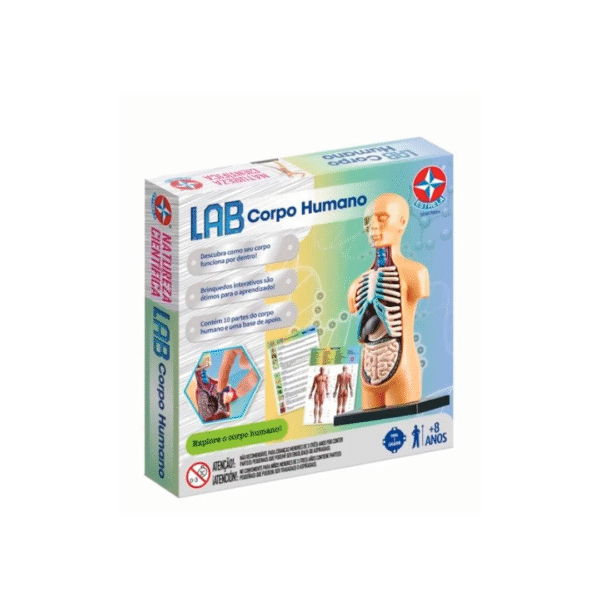 LAB Corpo Humano promove o aprendizado da anatomia humana e conta com 9 peças de órgãos do corpo humano, 1 corpo e 1 base de apoio. As peças que representam os órgãos devem ser encaixadas no corpo, formando sistema interno humano. Além disso, há cartelas educativas sobre a localização e as funções de cada órgão.